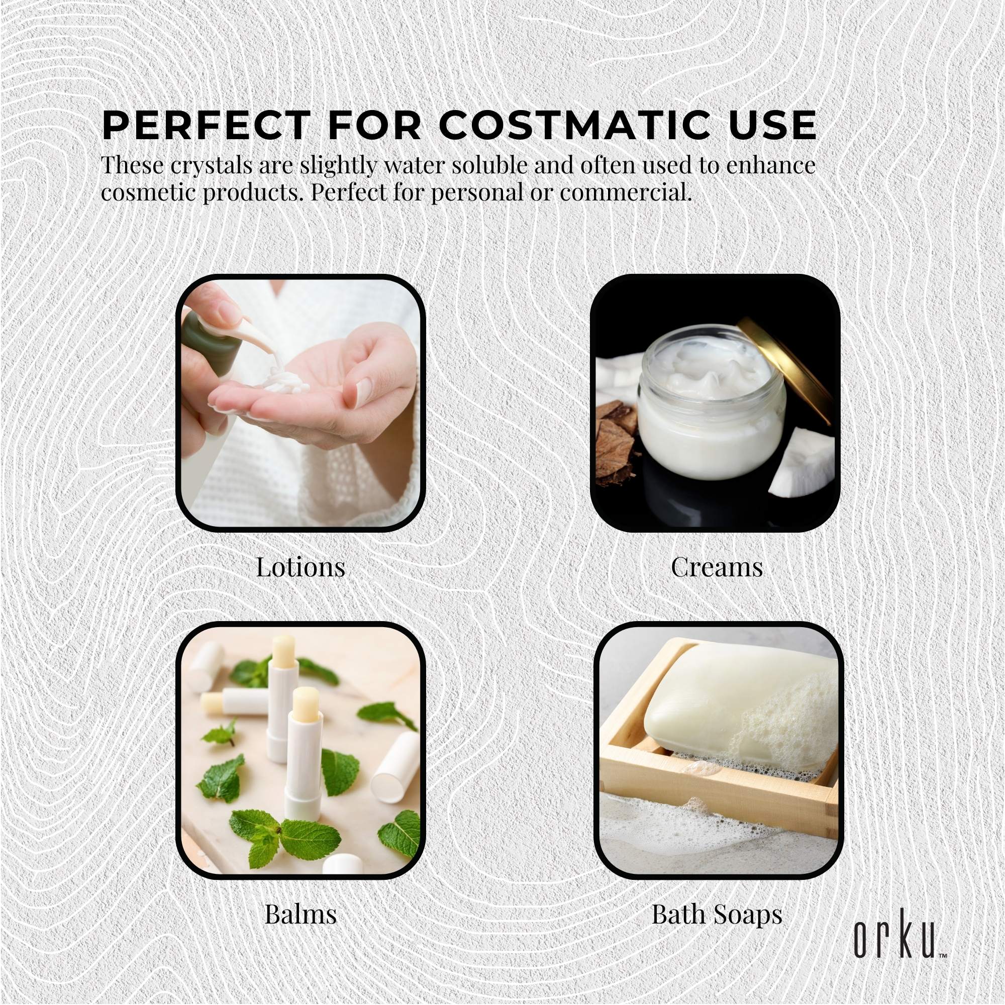These crystals are slightly soluble in water and fully soluble in ethanol, making them ideal for custom formulations in products like balms, lotions, creams, and candles.