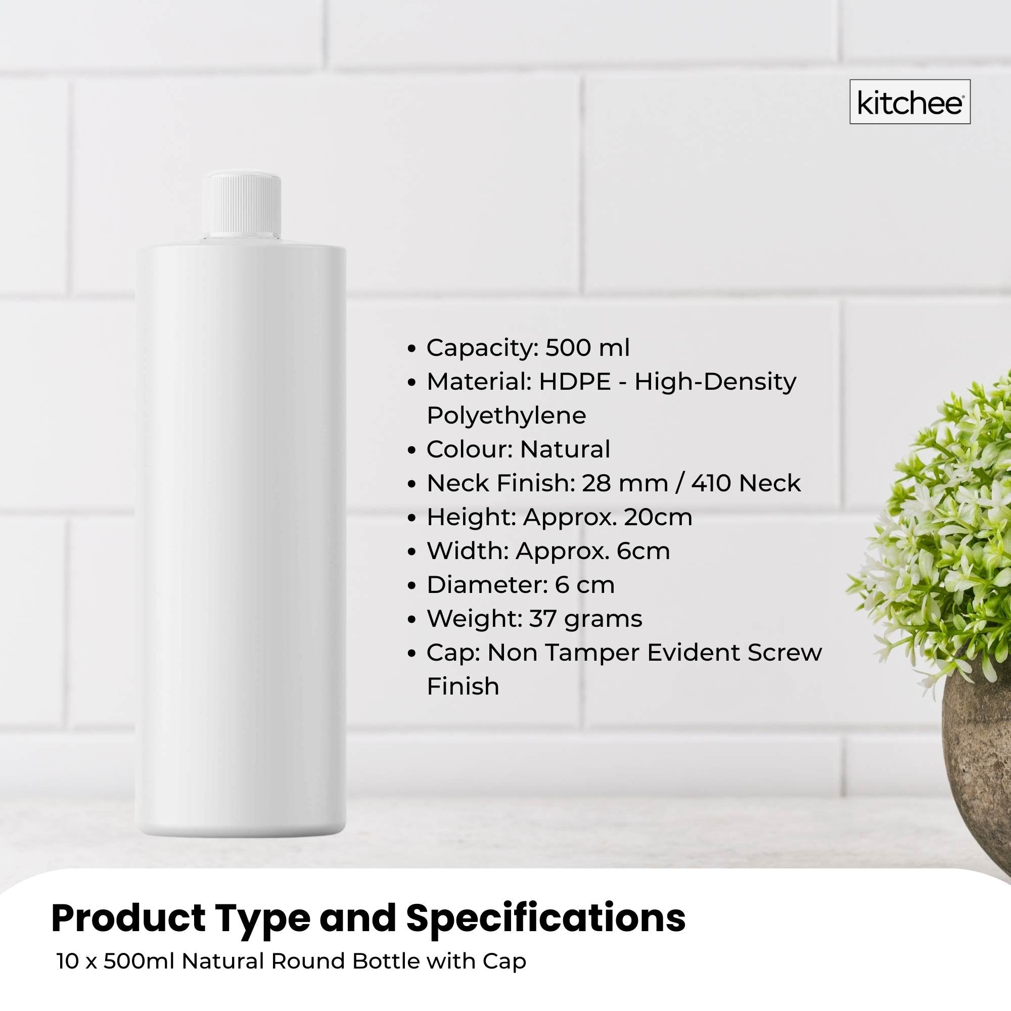 10 x 500ml Natural HDPE Plastic Round Bottle with 28mm / 410 neck finish and a white lined non-tamper evident screw finish.