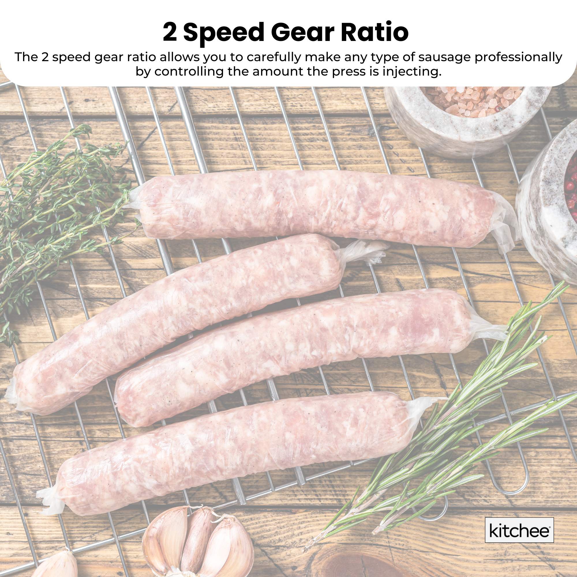 The 2 speed gear ratio allows you to carefully make any type of sausage professionally by controlling the amount the press is injecting.