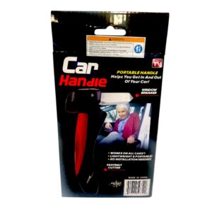 This portable car handle provides support when getting in and out of a vehicle. Includes LED flashlight, window hammer and seat belt cutter.