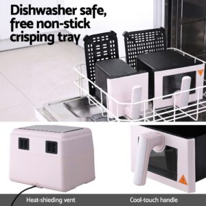 Enjoy healthy fried foods with our 9L Dual Zone Air Fryer. Its 3.5L+5.5L independent baskets cook two dishes at once using 4-in-1 functions (Air Fry, Roast, Reheat, Dehydrate). 360° hot air circulation ensures crispy results, while 10 presets and a touch display make cooking effortless. Features a 60-200°C range, 60-min timer, and dishwasher-safe parts for easy cleaning. Modern and elegant, it’s the perfect efficient upgrade for your kitchen.FeaturesDual zone 3.5+5.5L capacityAir fryer with 2 independent baskets to cook 2 foods,2 ways at the sametime4-in-l versatility: Air Fry, Roast,Reheat,and DehydrateLarge touch display with auto menusTouch control10 Pre-set cooking programs.Elegant appearance to present modern brand image360 ° Hot air circulation, crispy food makerAdjustable temp. ranges from 60 – 200°c to suit avariety of recipesUp to 60 minutes timer settingDishwasher safe oil basket with metal inner housingFree non-stick crisping trayEasy to cleanEasy-to-read and adjustable displaySAA approvalSpecifications:Brand: DevantiColour: PinkMetal:Stainless Steel, Polypropylene (PP)Power: 2600WControl type: Touch controlFryer basket capacity: 3.5+5.5LAdjustable temperature: 60℃-200℃Timer setting: 0-60 minutesVoltage:220-240V~50/60HzLeft Basket diameter: 15cm x 30cm x 13cm Right Basket diameter:21cm x 30cm x 13xmOverall dimensions:37cm x 35cm x 28cmPackage ContentDevanti Air Fryer X1User Manual X1Fried plat X2This product comes with 1 year warranty