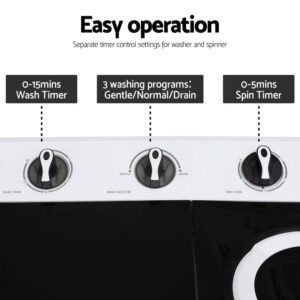 Unleash the power of convenience with our Devanti Portable Twin Tub Washing Machine. Designed for efficiency and ease of use, it features a generous 7kg washing capacity and 4kg spinning capacity—perfect for handling daily laundry in a single go. Its twin tub design allows you to wash and spin simultaneously, saving you valuable time and effort. With its powerful dual motor system, this machine boasts 380W washing power and 160W spinning power. The intuitive three-knob control panel with Gentle/Normal/Drain modes ensures simple operation for everyone, even the elderly. Separate timers for washing (up to 15 minutes) and spinning (up to 5 minutes) give you complete control over your laundry cycle. Its compact, lightweight, and no-installation design makes it ideal for small spaces, offering a convenient, space-saving solution to your laundry needs. No installation is required—just plug it in and get started.Features7kg wash capacity4kg spin dryer capacityTwin tub design (separate wash/spin)380W powerful wave pulsatorCompact & lightweight (easy transport)Simple knob controlsBuilt-in handle for portabilityDetachable lint filterQuiet operation (≤58dB)SAA-approved (AU plug)Specifications:Material: PlasticMaximum capacity: 7kgRated spin capacity: 4kgWashing input power: 380WSpinning input power: 160WVoltage: AC220-240V, 50/60HzLevel of noise: ≤ 58dBOverall dimensions: 62x32x86cmNo. of packages: OneAssembly required: NoPackage Content(1) Portable Washing Machine x1(2) User Manual x1This product comes with 1 year warranty