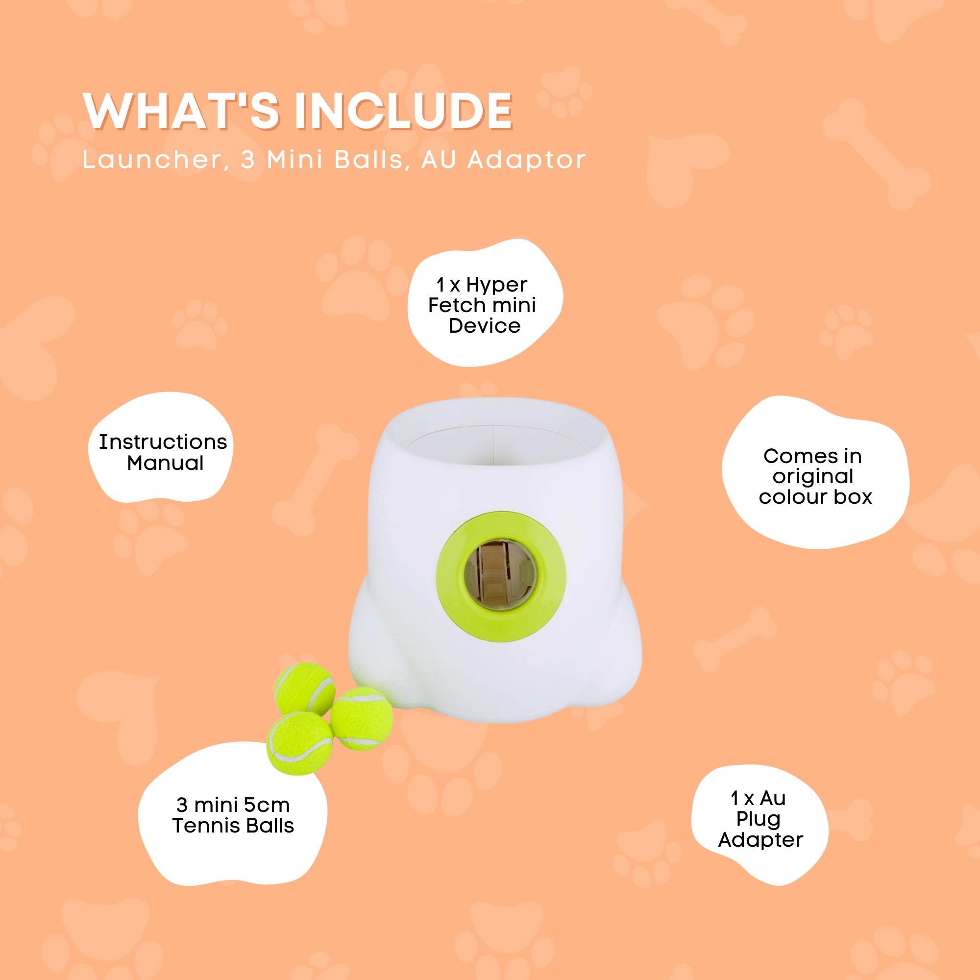 Package Includes: Hyper Fetch Mini Launcher, 3 x Mini Tennis Balls, AU AC Power Adaptor