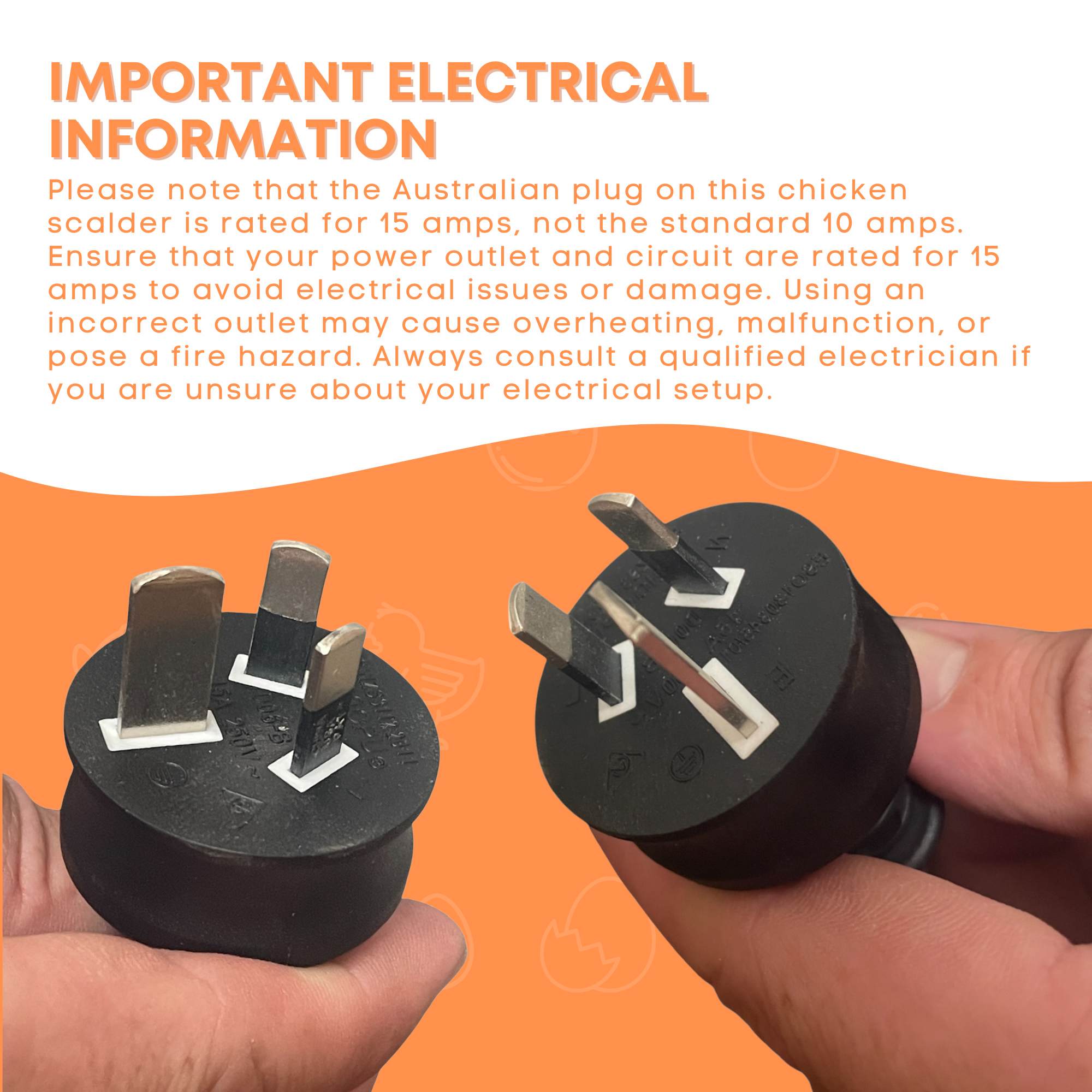 This unit is fitted with a 15 amp Australian plug. A suitable 15 amp power outlet and circuit are required. Do not use with standard 10 amp outlets. Consult a qualified electrician if unsure.