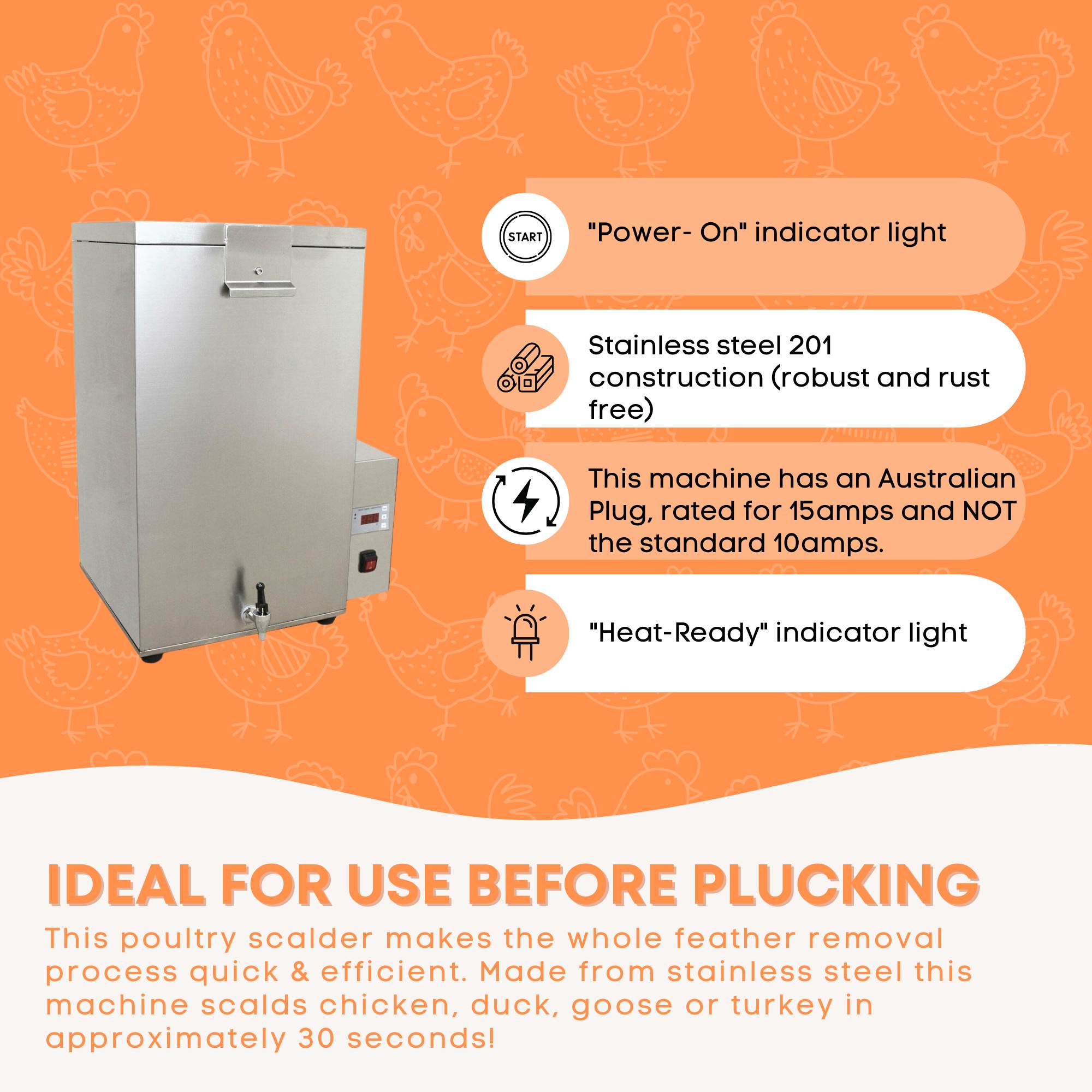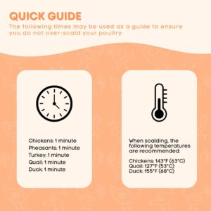 Immersion times and temperatures vary depending on poultry type and size. Avoid excessive temperature or immersion time, as over scalding may damage skin or partially cook the bird.