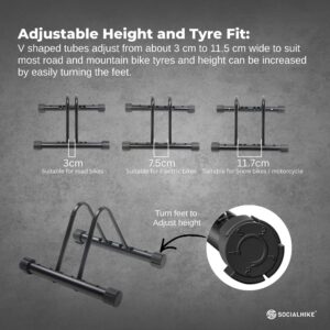 - Adjustable Height and Tyre Fit: V shaped tubes adjust from about 3 cm to 11.5 cm wide to suit most road and mountain bike tyres and height can be increased by easily turning the feet.