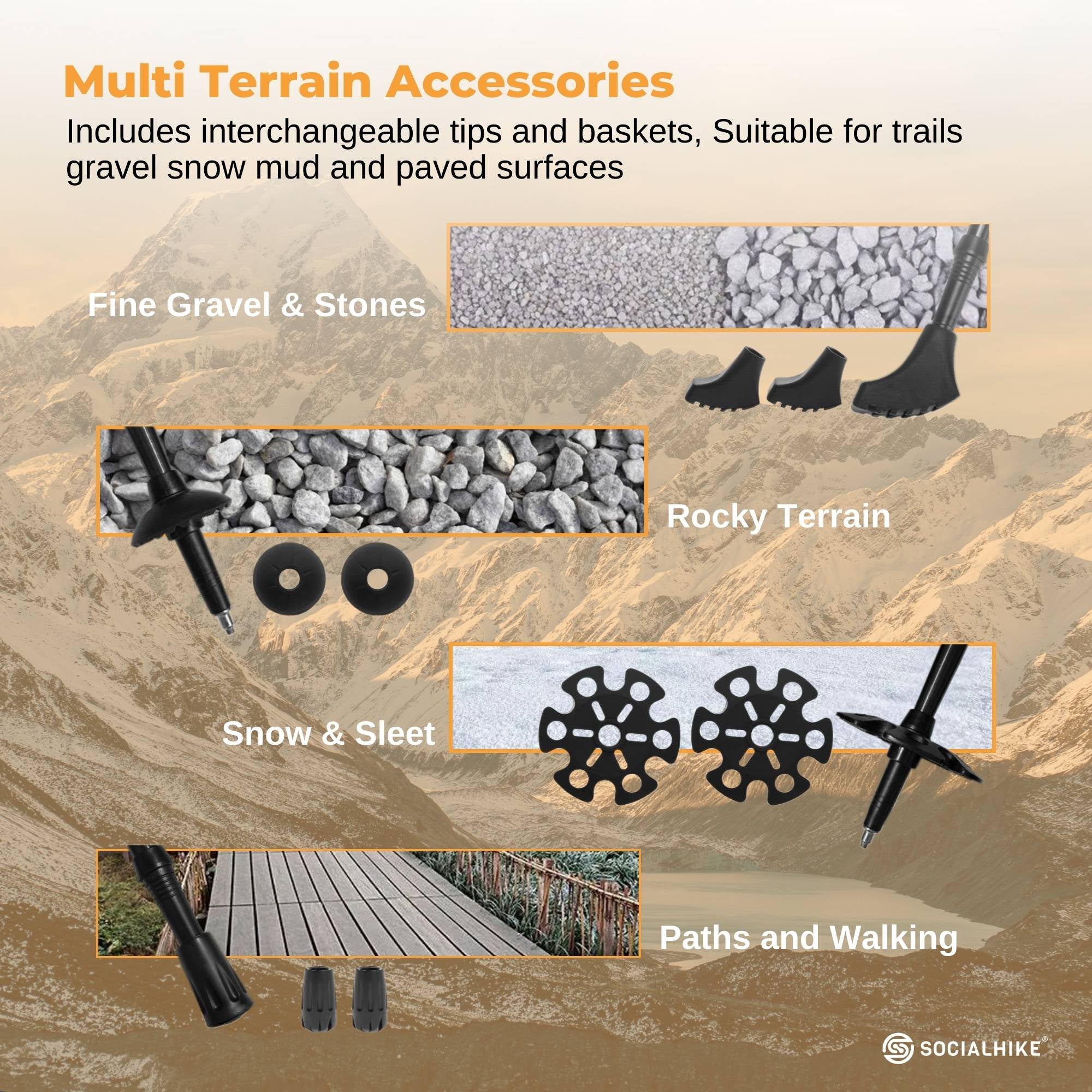 • Multi Terrain Accessories Included: Supplied with 4 sets of interchangeable tips and baskets suitable for gravel, dirt, snow, mud, and paved surfaces.