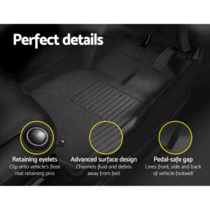FeaturesPremium quality TPR top finishCustom moulded and laser cutNon-slip backingHigh coverageAll-in-one designEasily cleaned with water and detergentOdourless (safe for allergy sufferers)Resistant to Water, Oils, UV sunlight, and other chemicalsUnaffected by temperature or changing weather conditions100% recyclable material